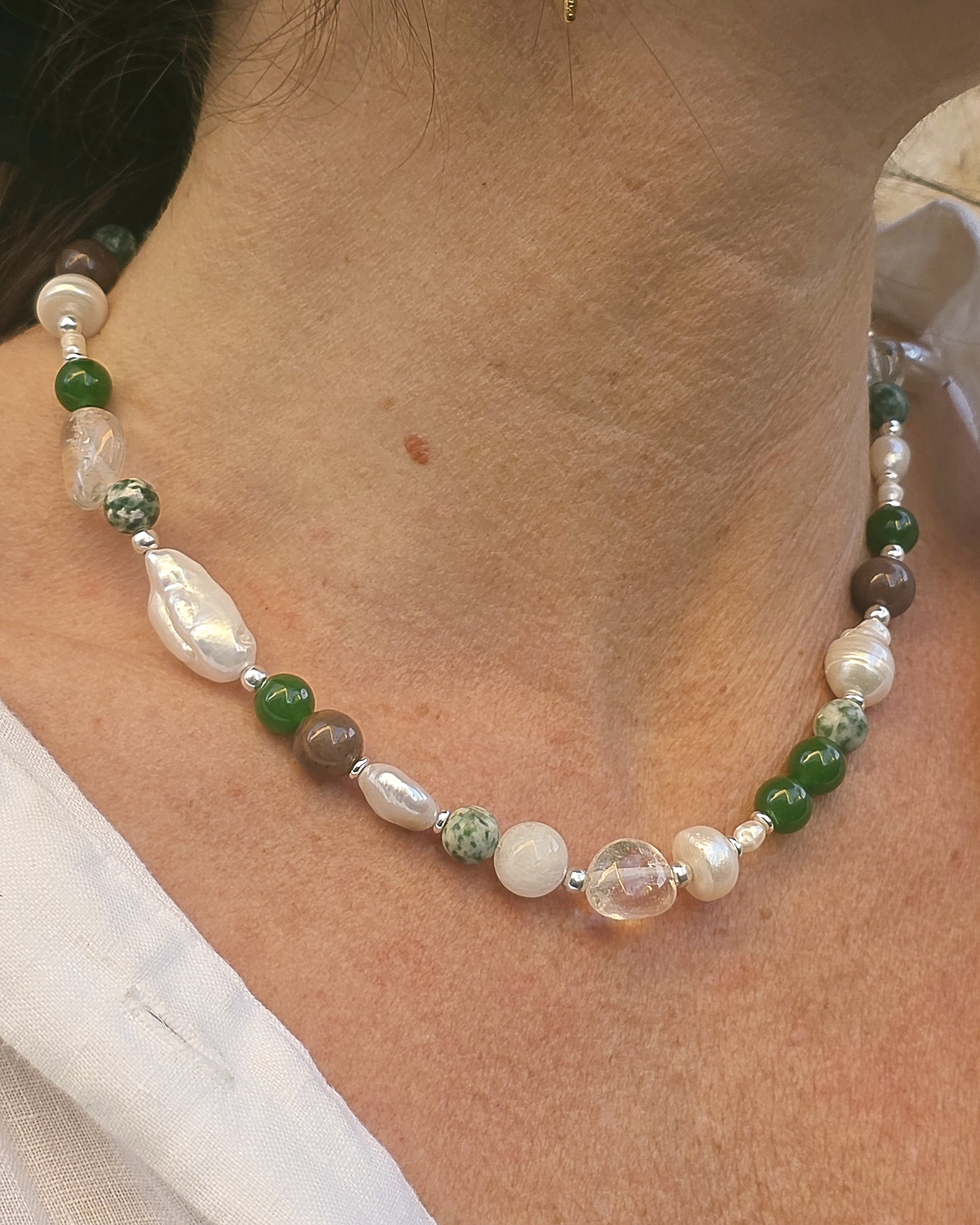 Made and inspired by the truly beautiful Dwellingup Forrest, a once of piece that embodies the magic of the forest. Tones and colour that bring each-other to life. Using mixed crystals and stunning pearls.