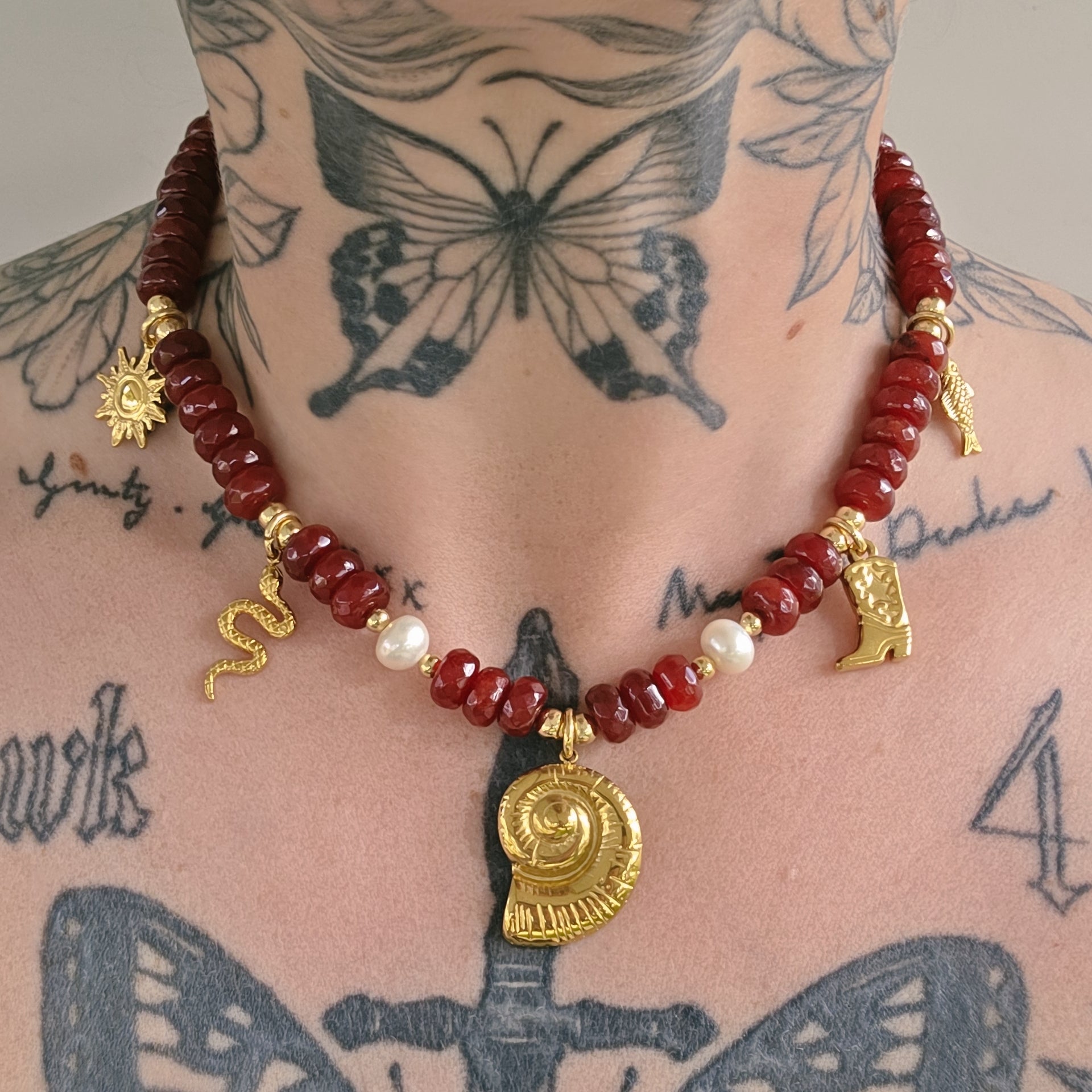 Deep red rhondel shape beads, matching rhondel shaped fresh water pearls, round gold hardware beads. With 5 pendant ( sun, snake, shell, cowboy boot, fish). She's going to demand attention.