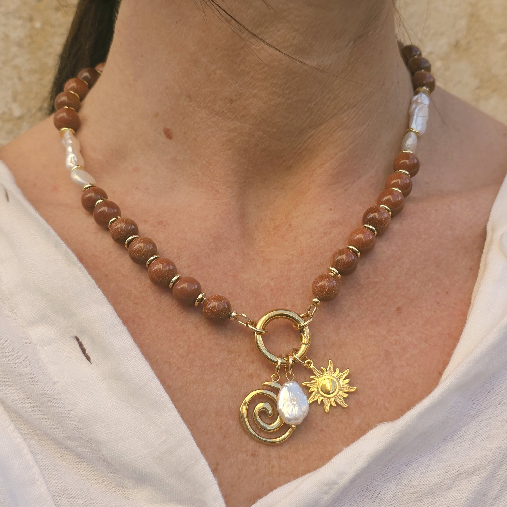 Embodying a strong feminine energy. Captivating gold stone beads that literally sparkle in the light, baroque and coin fresh water pearls. Featuring a charm ring that makes changing the look of this piece to seamless. With interchangeable charms that just make her that much more fun!