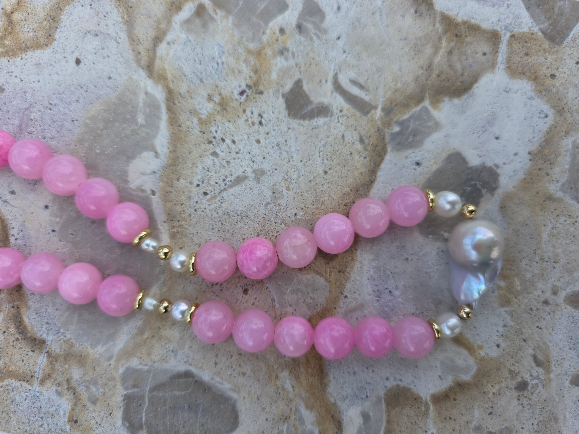 Made with stunning dyed pink jade, gold plated tarnish resistant hardware and fresh water pearls.
