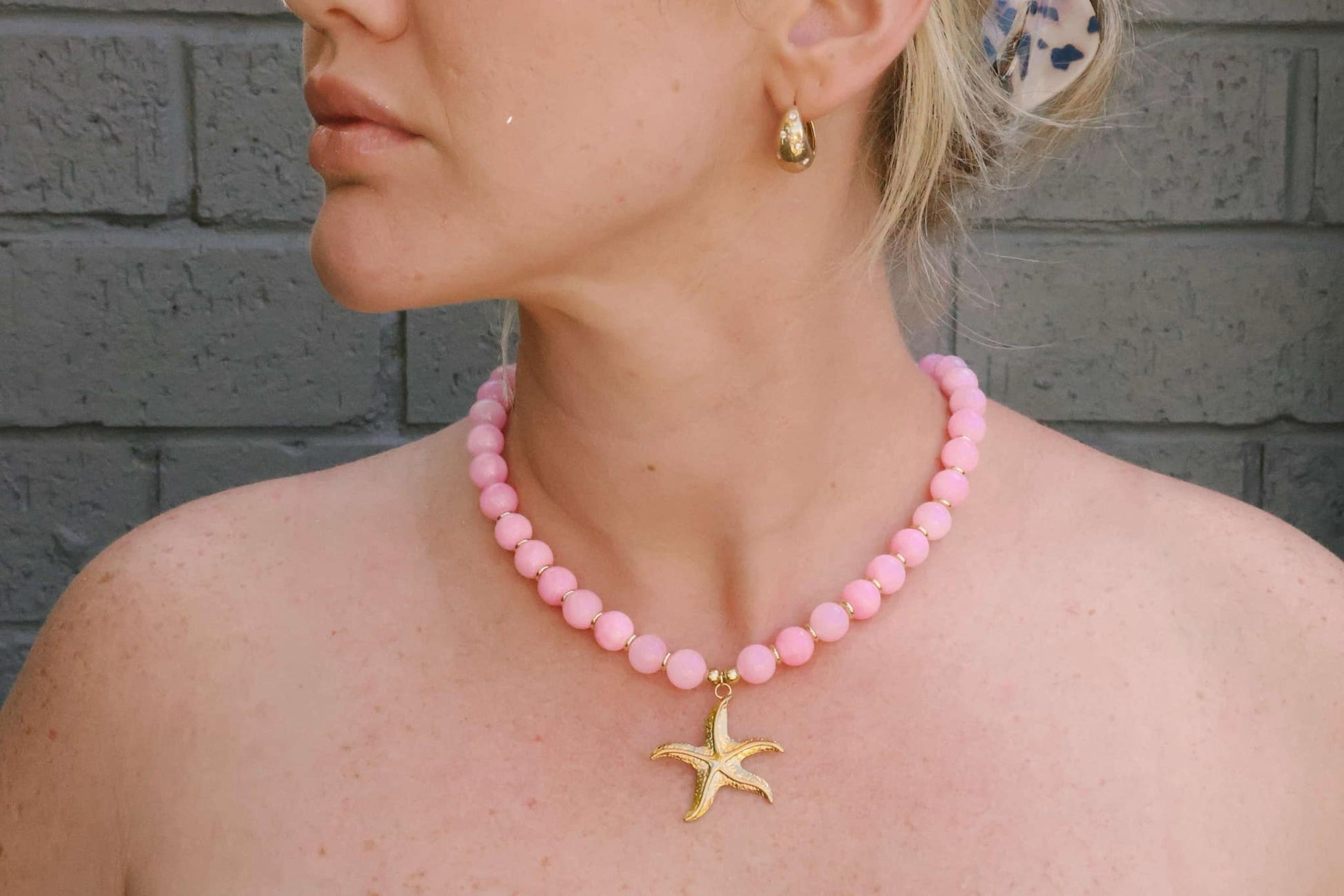 A vibrant pop of colour with her stunning dyed jade beads, a flat spacer bead paired with the magical star fish pendant.