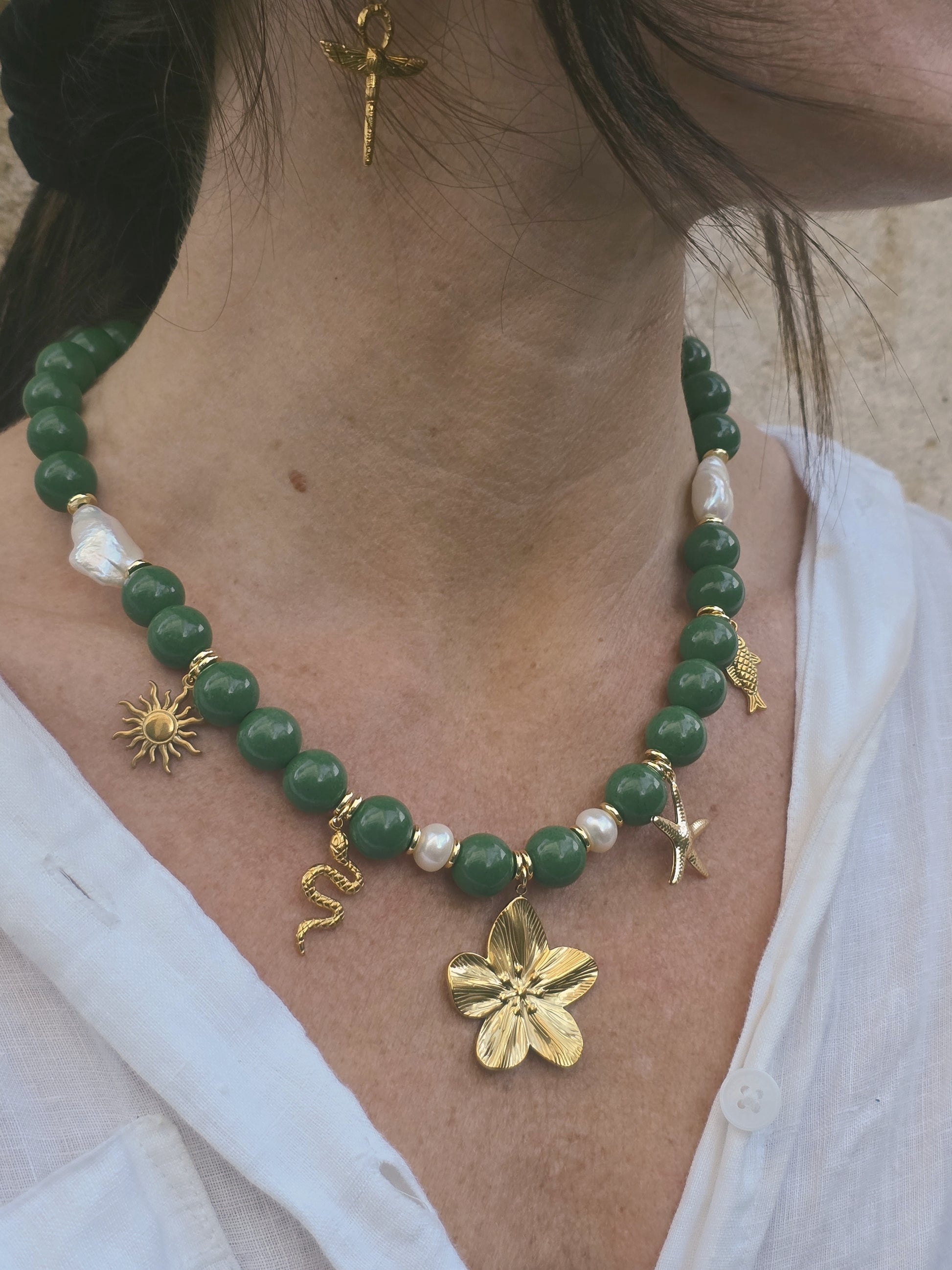 Made and inspired by the breathe taking Dwellingup up forrest. Enriched with all of the magic from the forrest. Large fresh water pearl, jade beads, gold plated hardware.