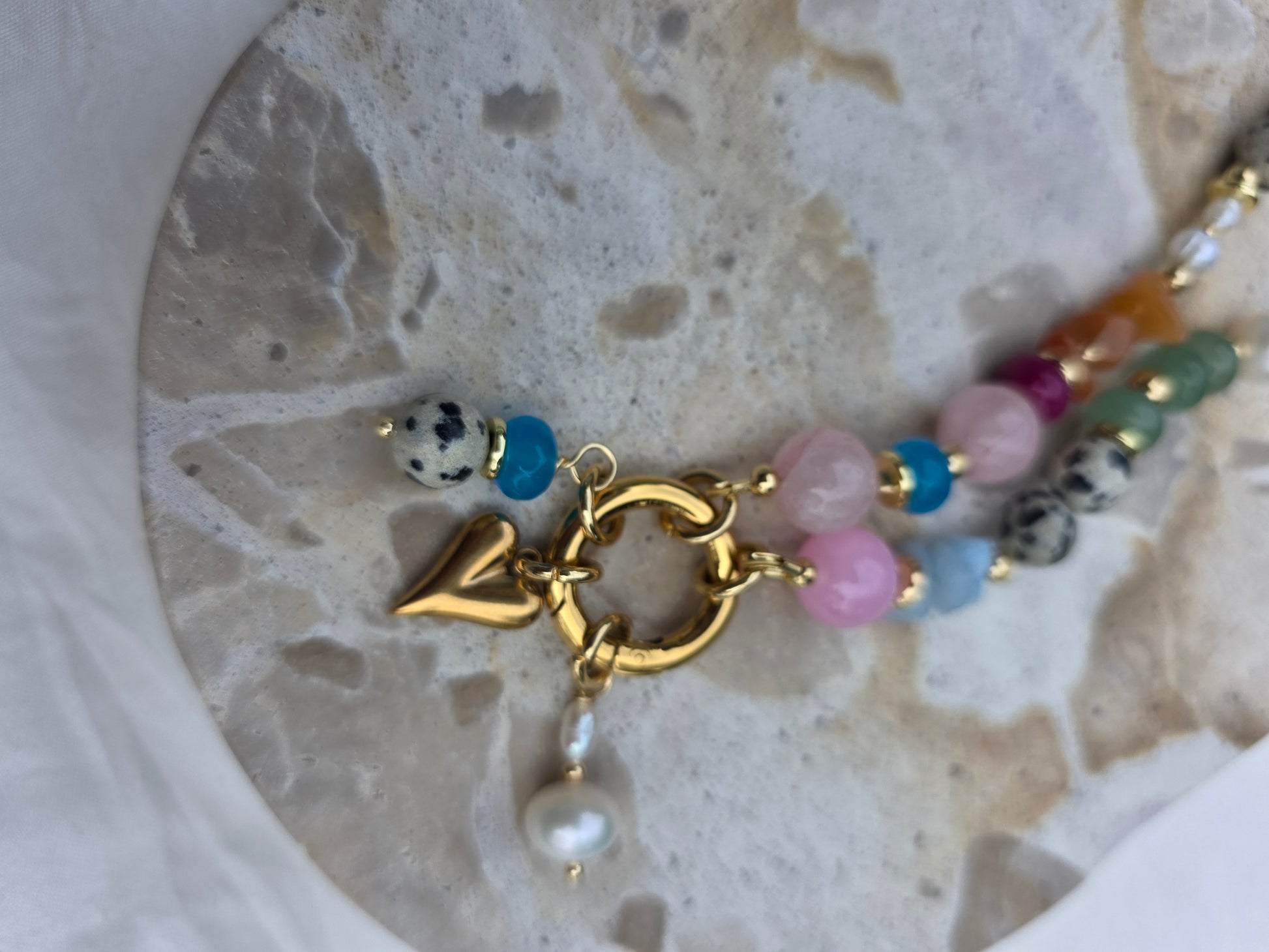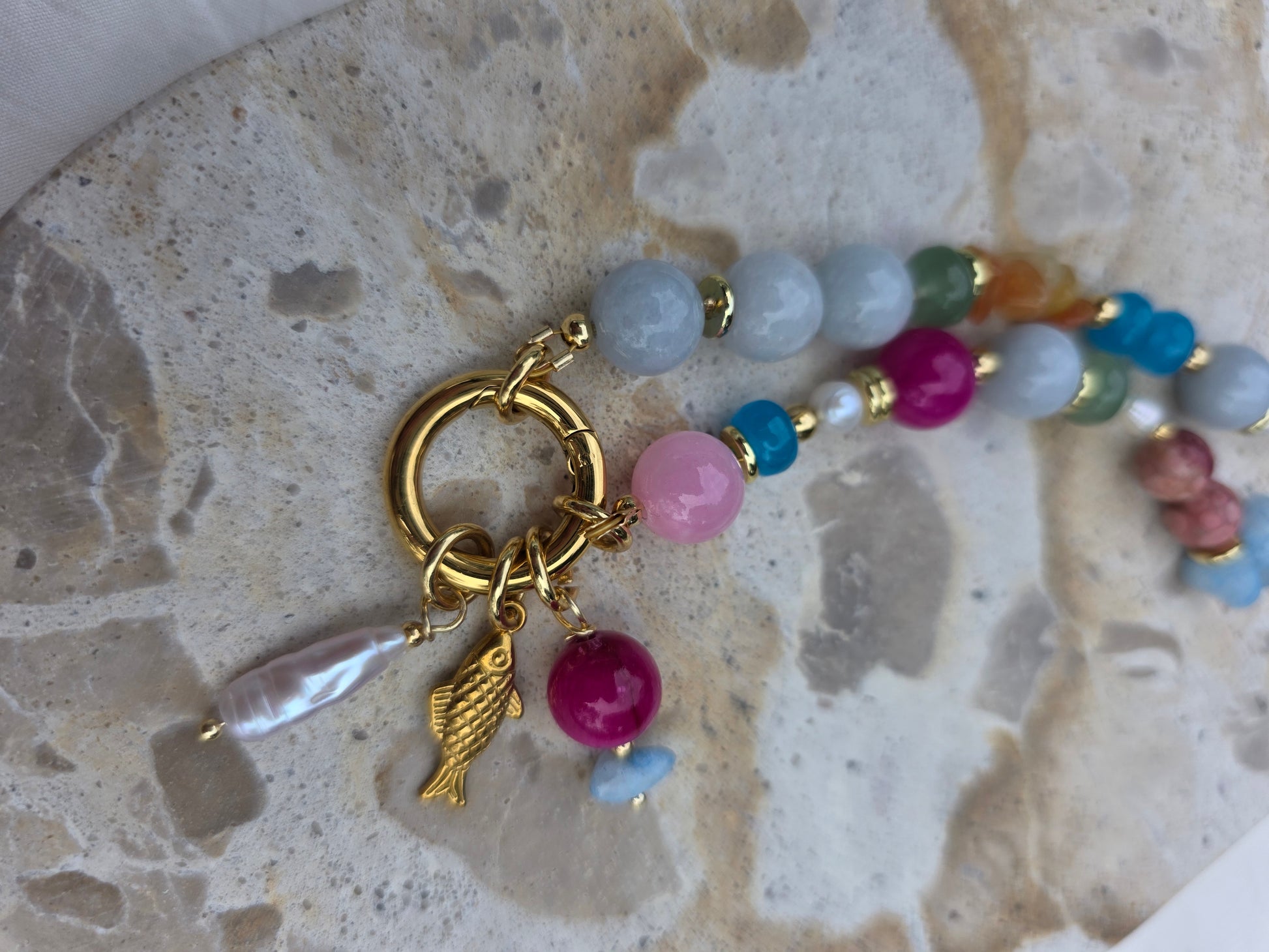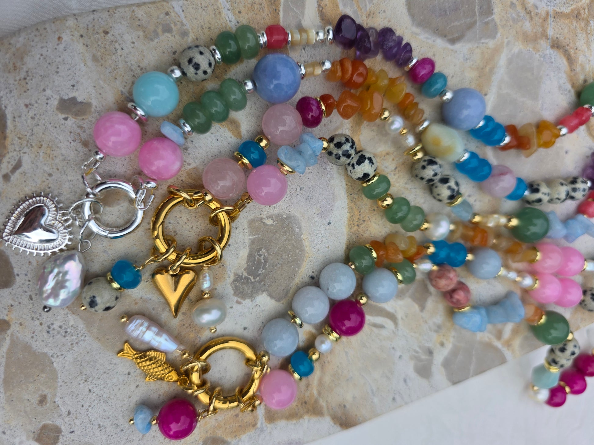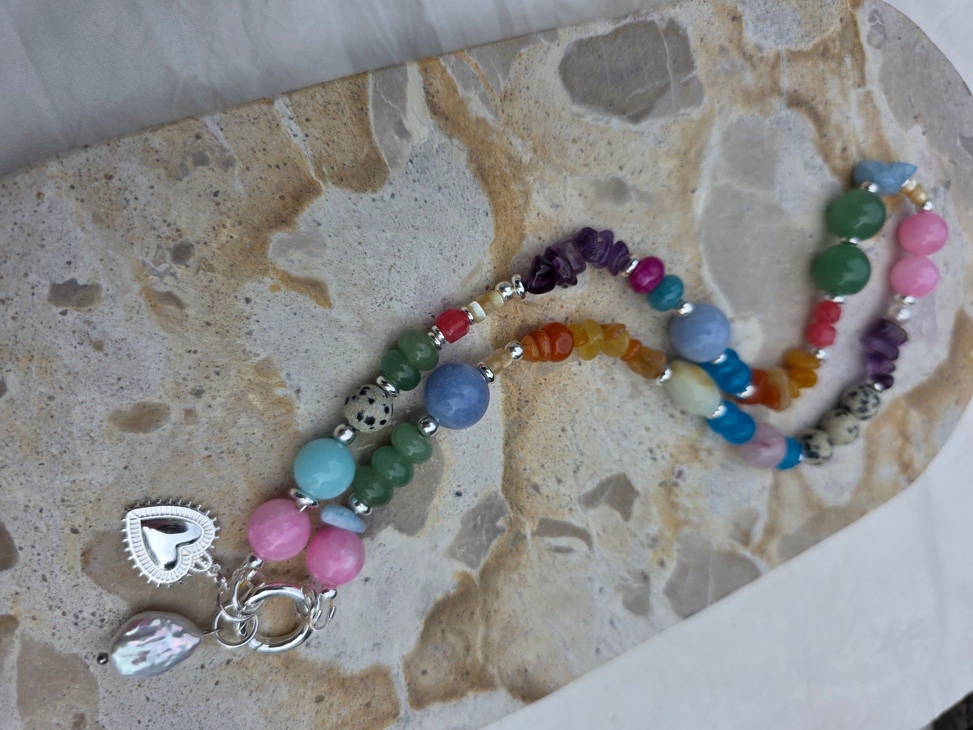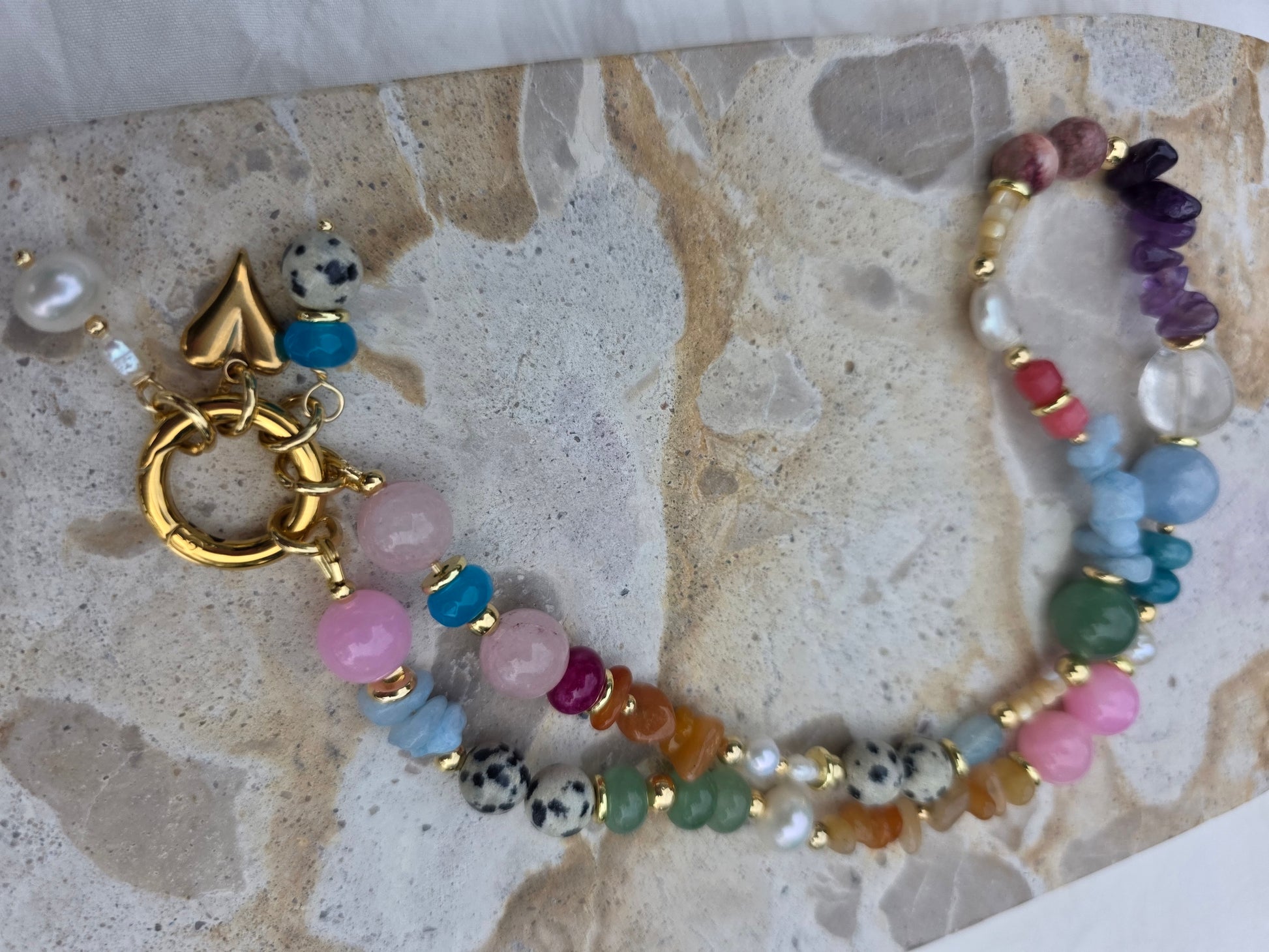 Colour, texture and shapes its all eye catching with this piece! She truly demands attention, with her mix of magical crystals, fresh water pearls and tarnish resistant hardware.