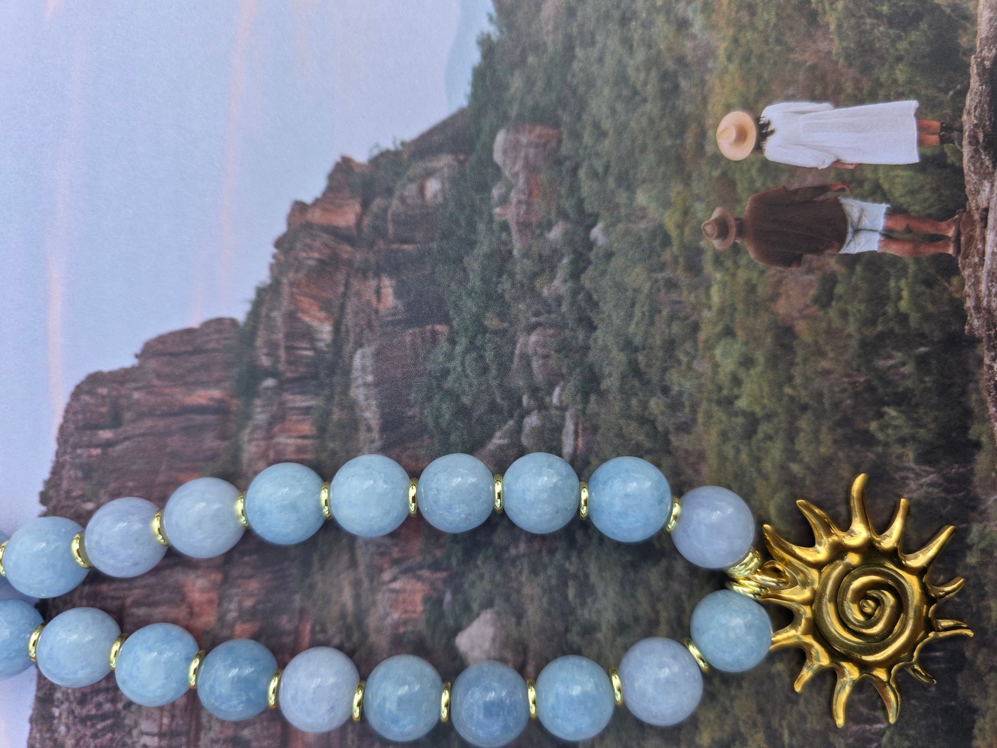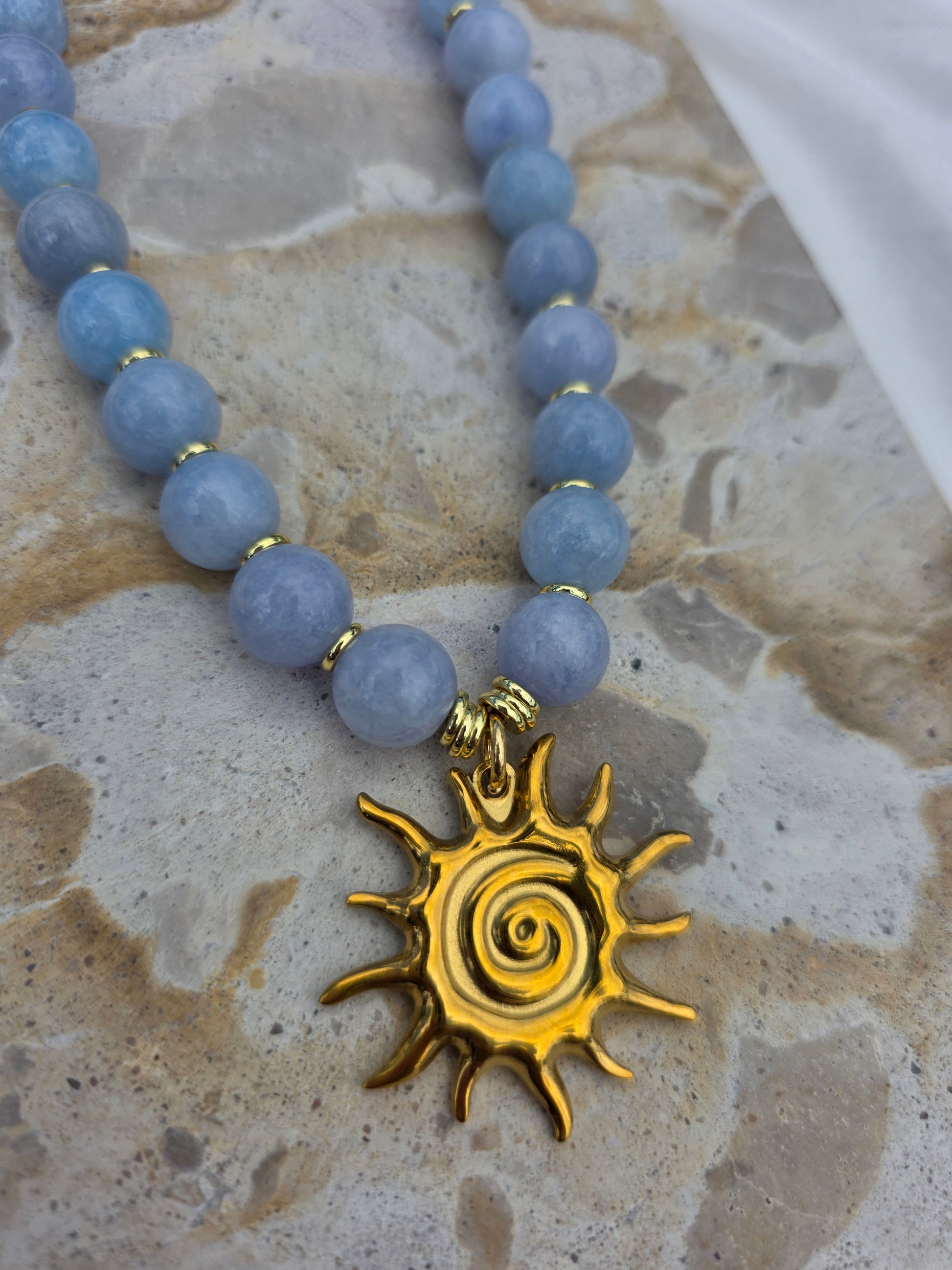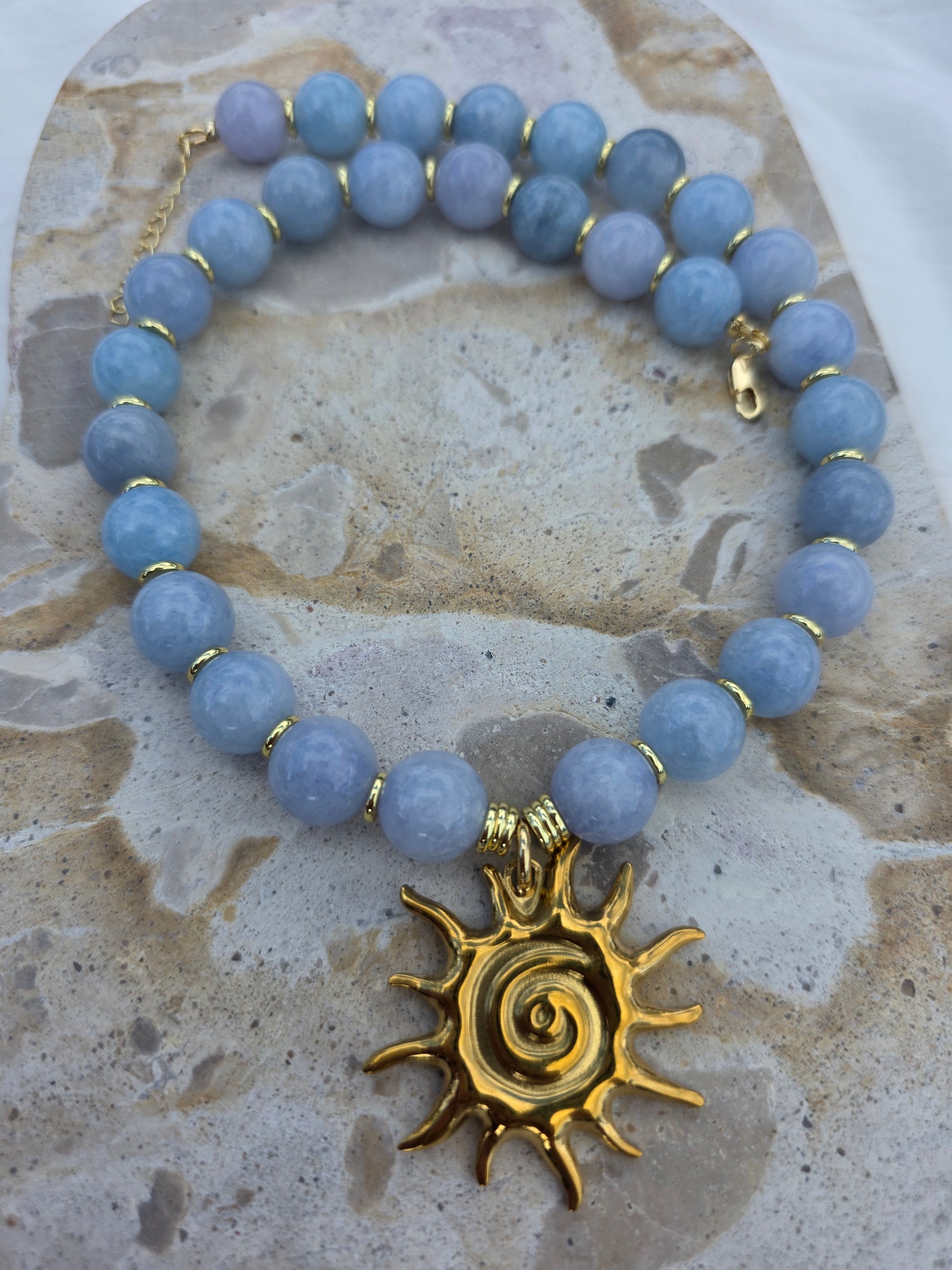 Yum chunky large Blue Aquamarine beads. With the most iconic sun pendant paired with flat round spacer beads both being gold plated tarnish resistant. She's a crowd fav!