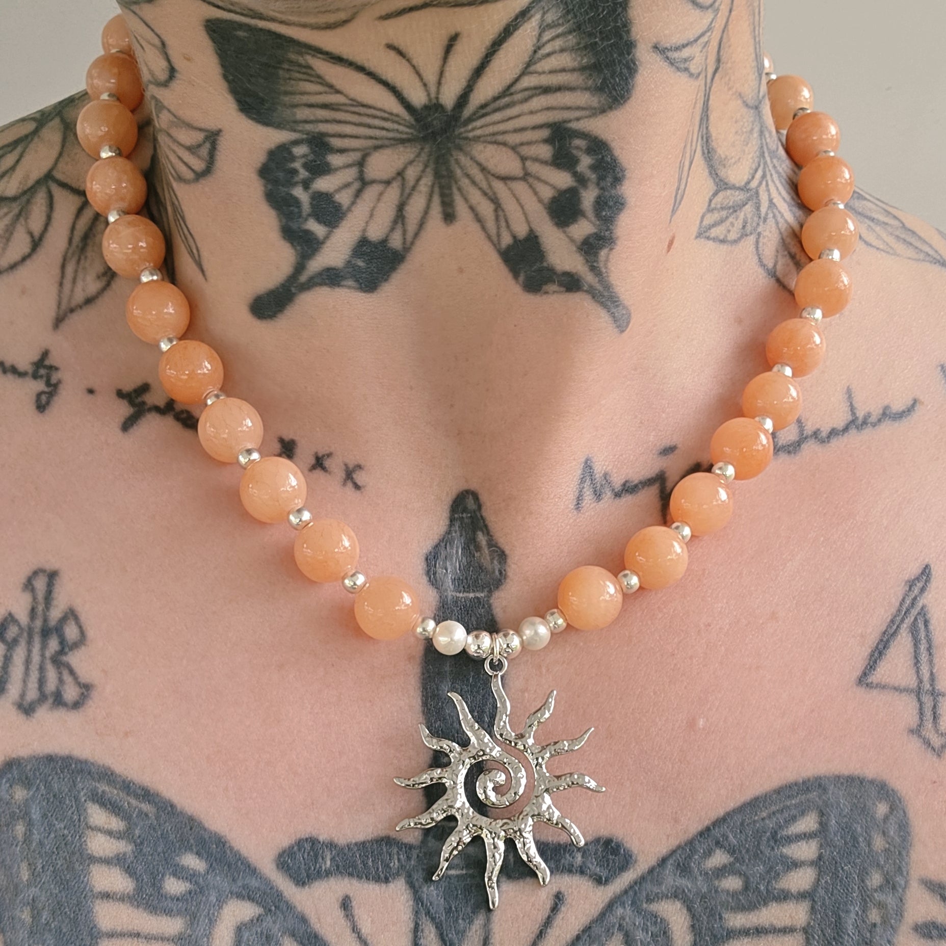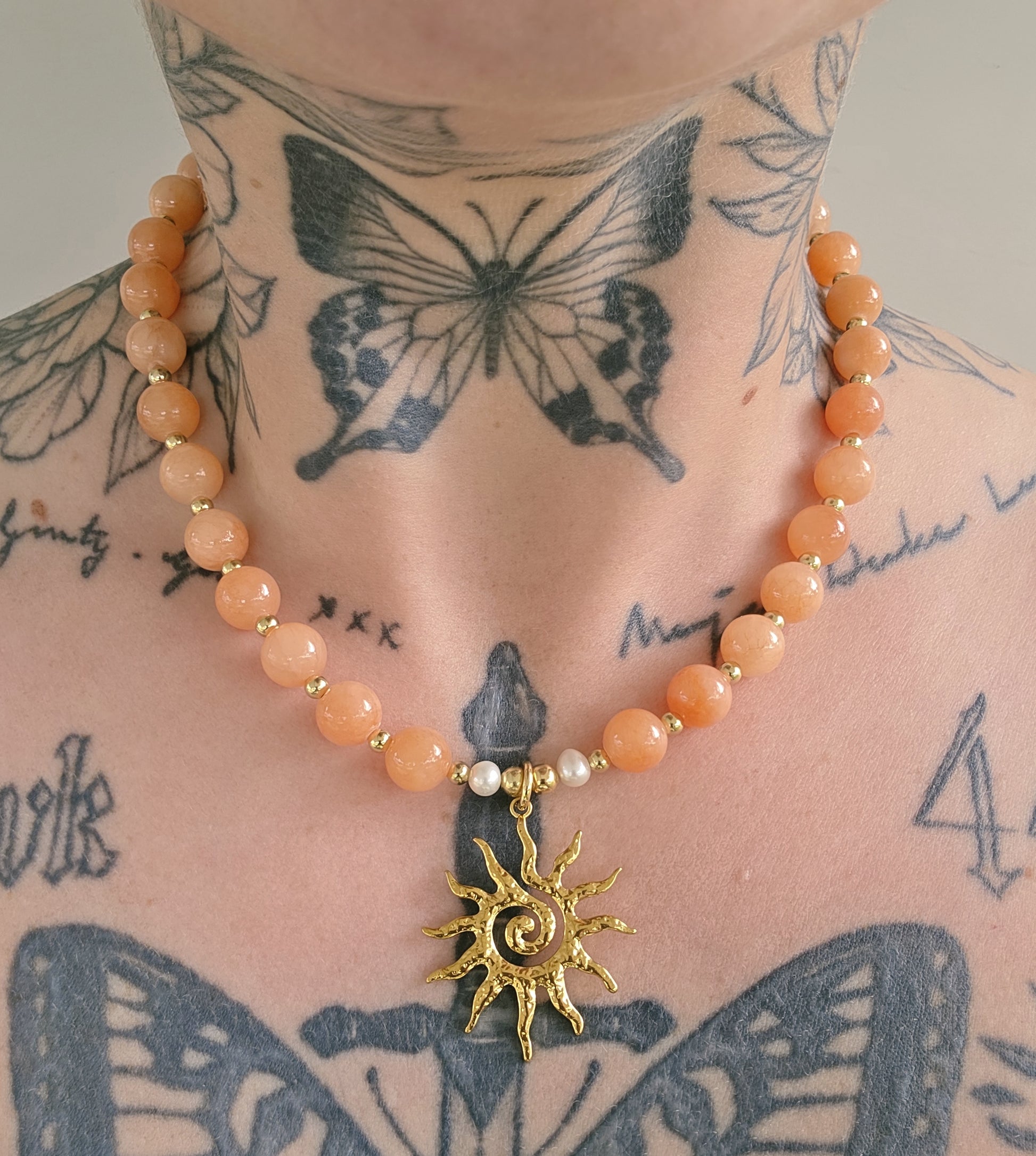Salt comes in gold and silver hardware for all girlies to enjoy wearing her! Combined with her warm orange tones of her Dyed Jade beads, featuring two fresh water pearls and a stunning sun pendant.