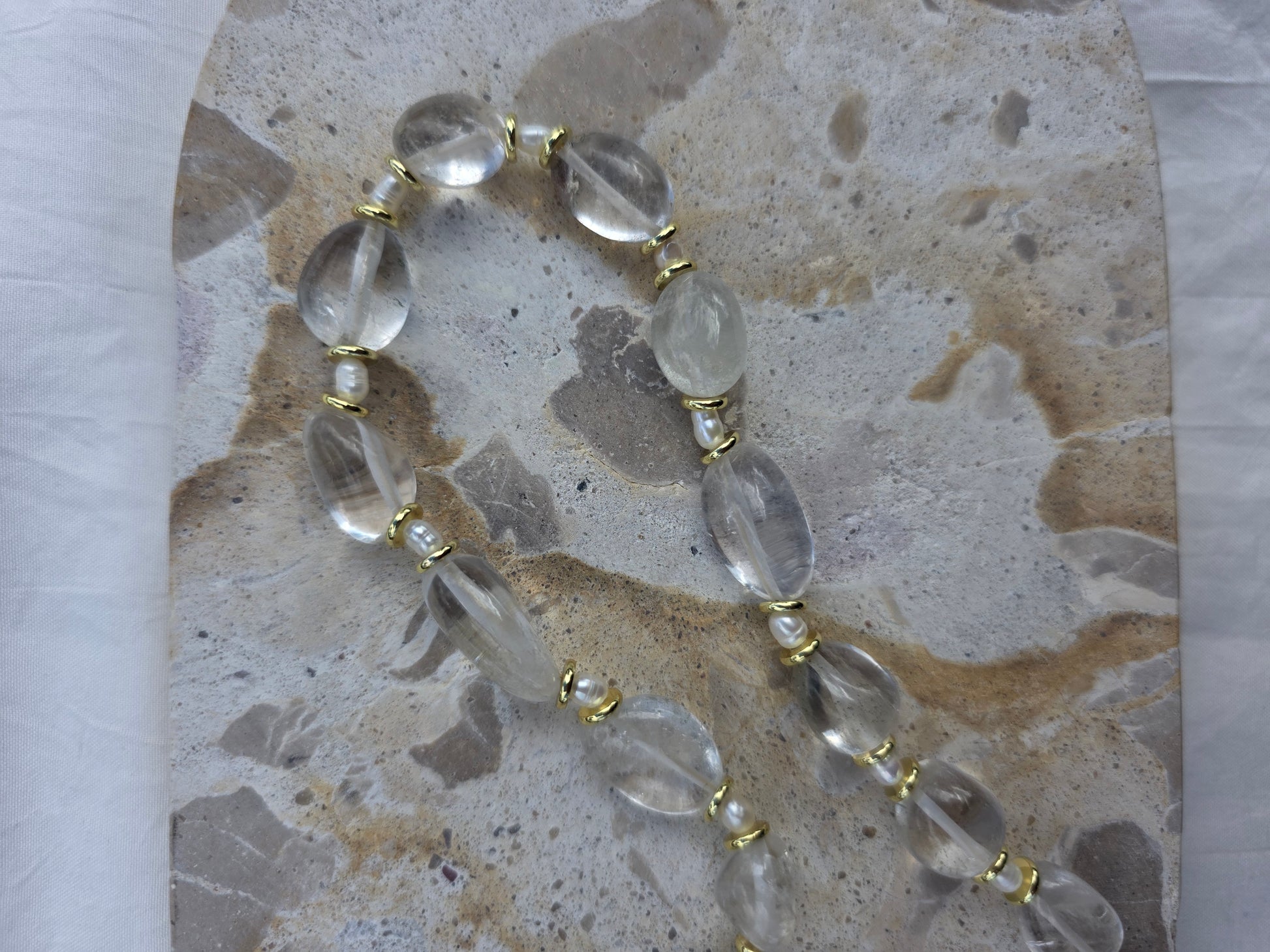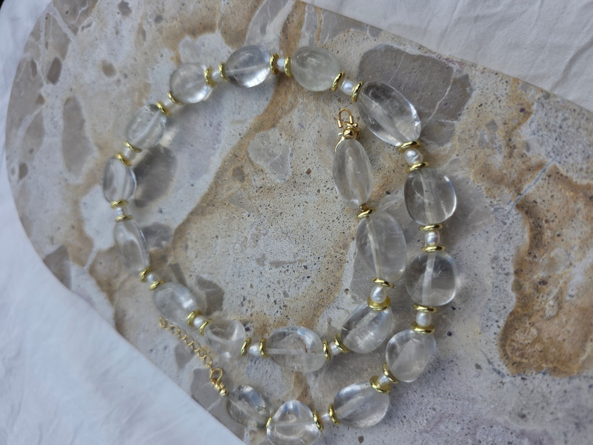 Chunky Clear Quartz nuggets, placed between are stunning mini rice pearls. With tarnish resistant hardware. She is a dream in her on but she also the perfect layering piece!