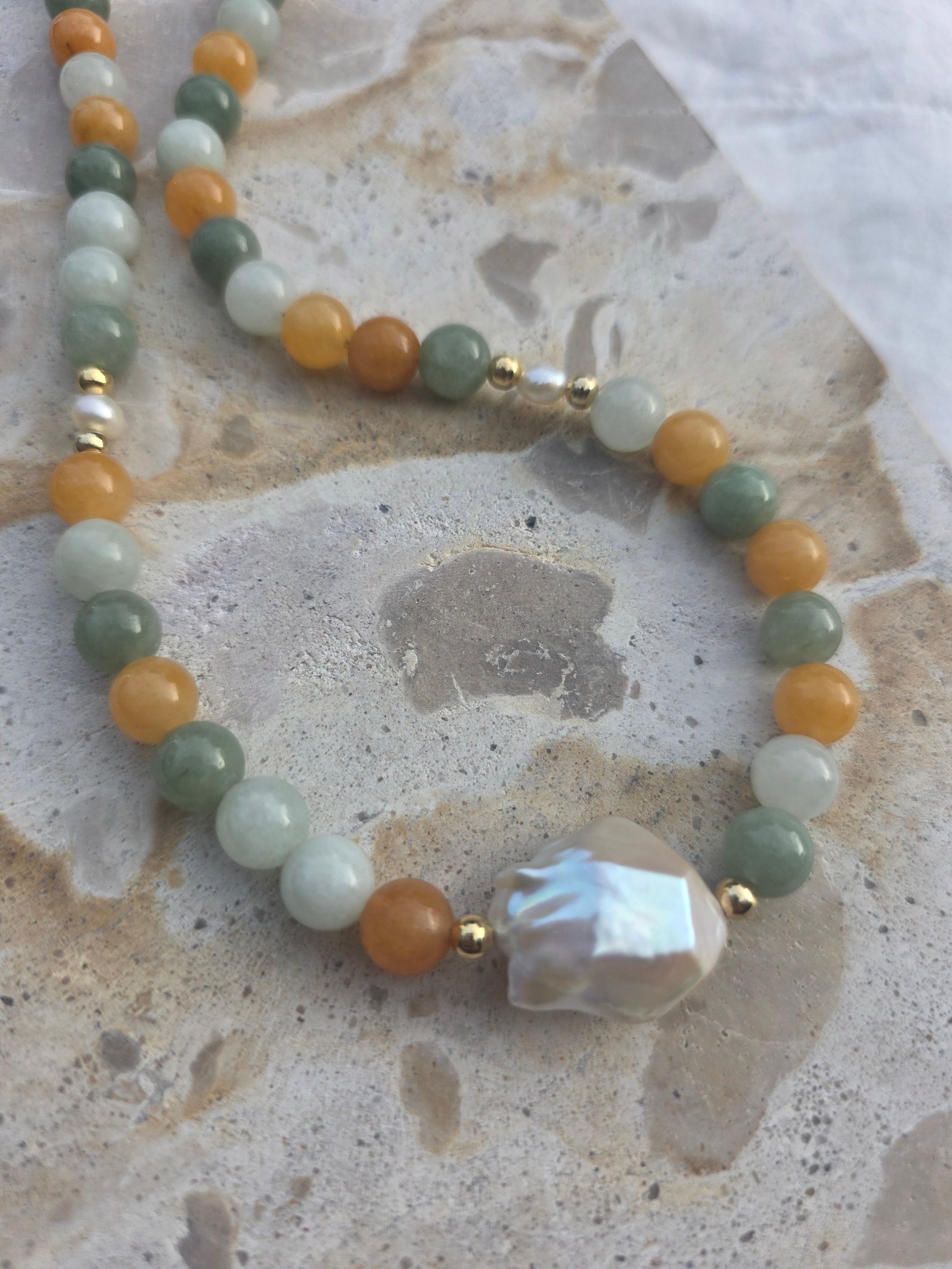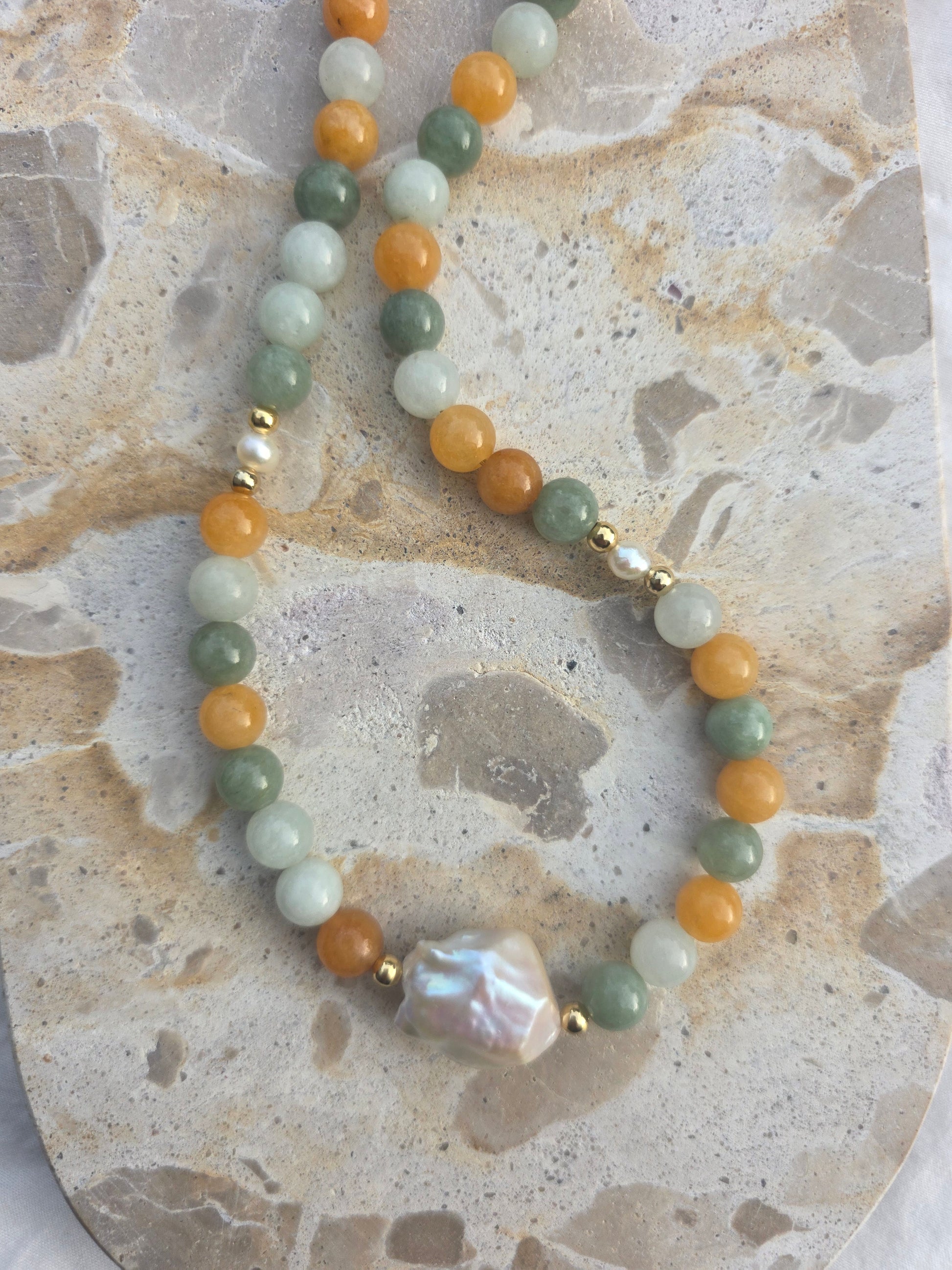 Earthy warm tones that are dyed jade. Fresh water pearls that just pop between the tones of summer. Silver or gold plated tarnish resistant hardware.