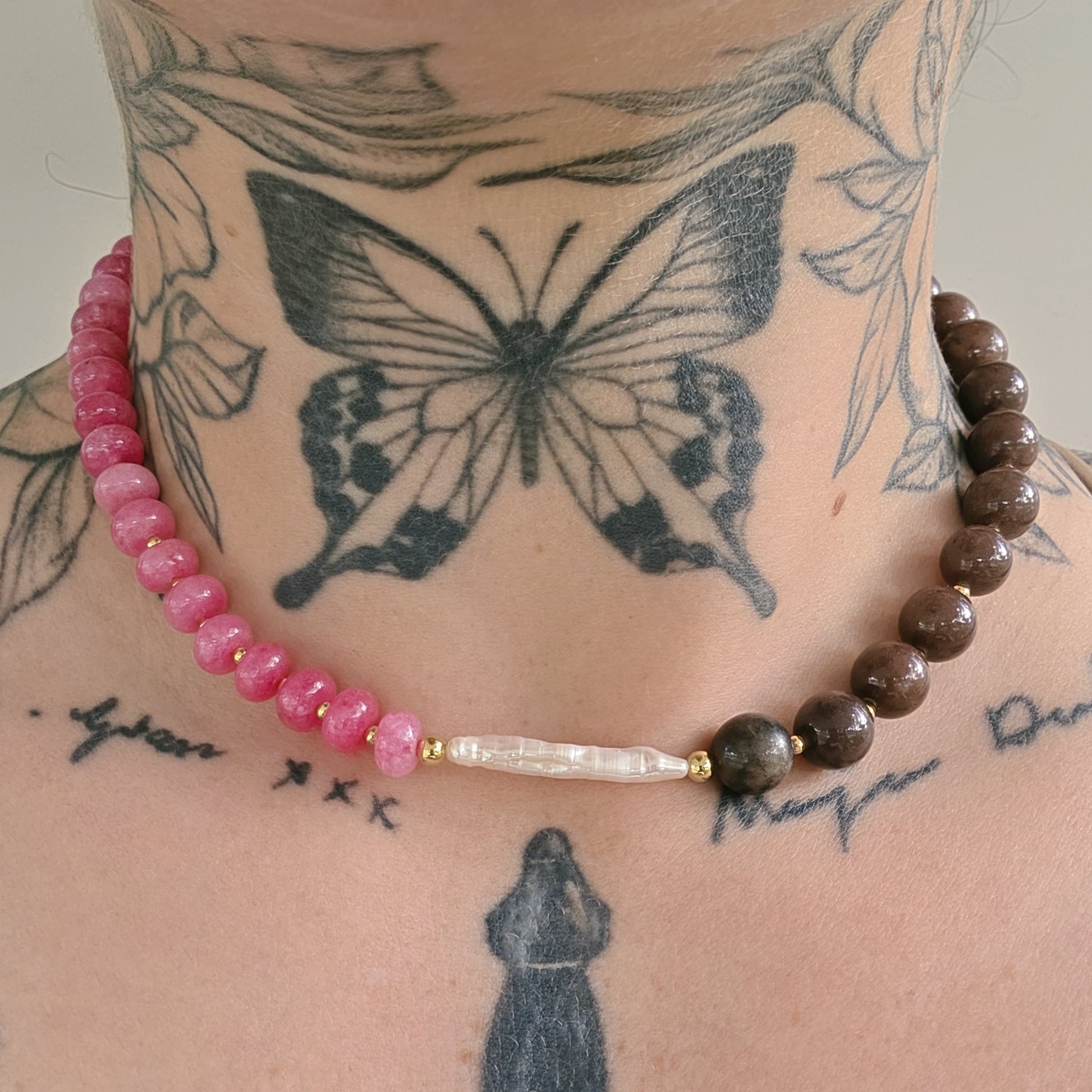 A playful piece with a stunning line fresh water pearl front and centre, surrounded by gold hardware.