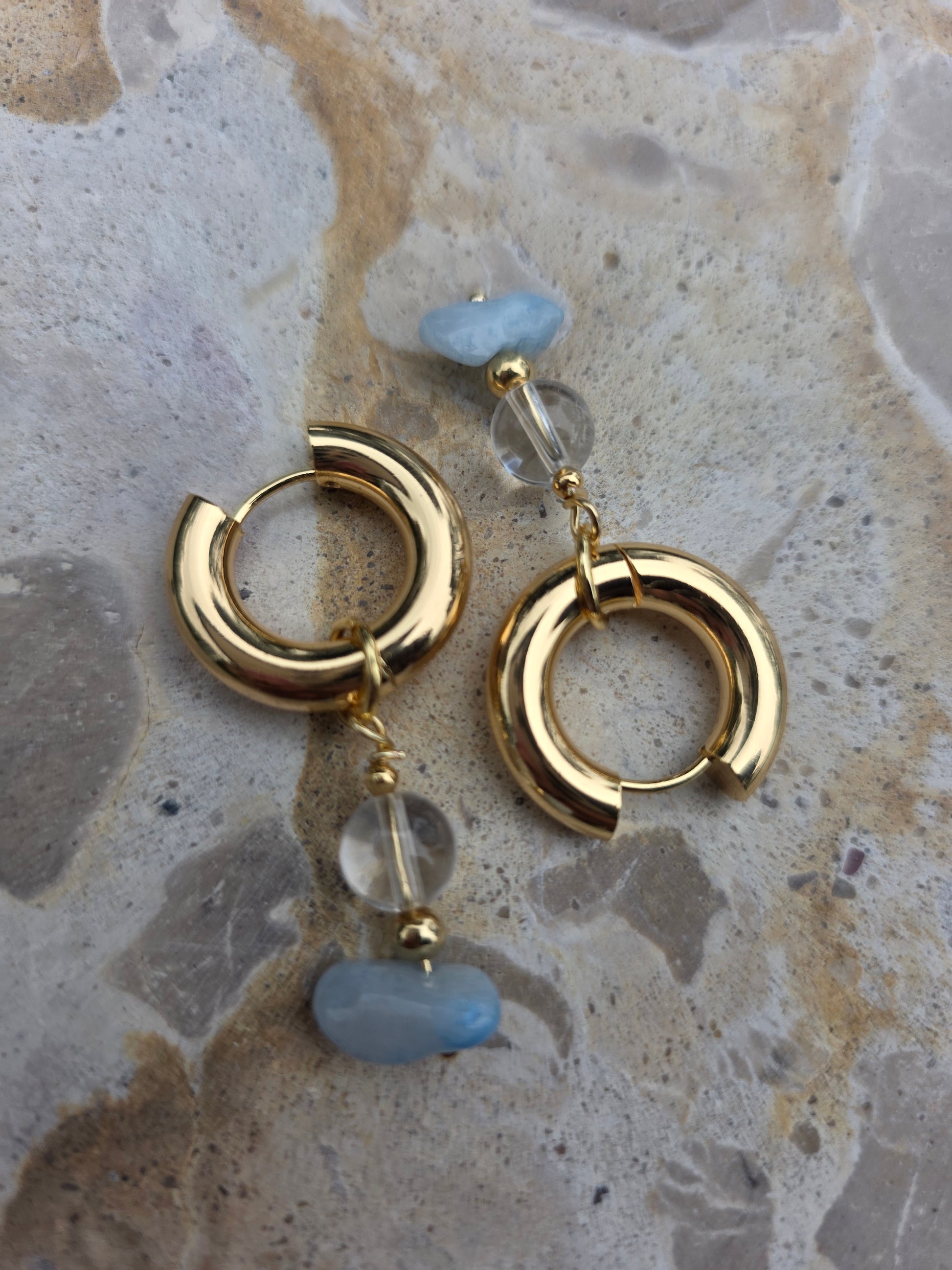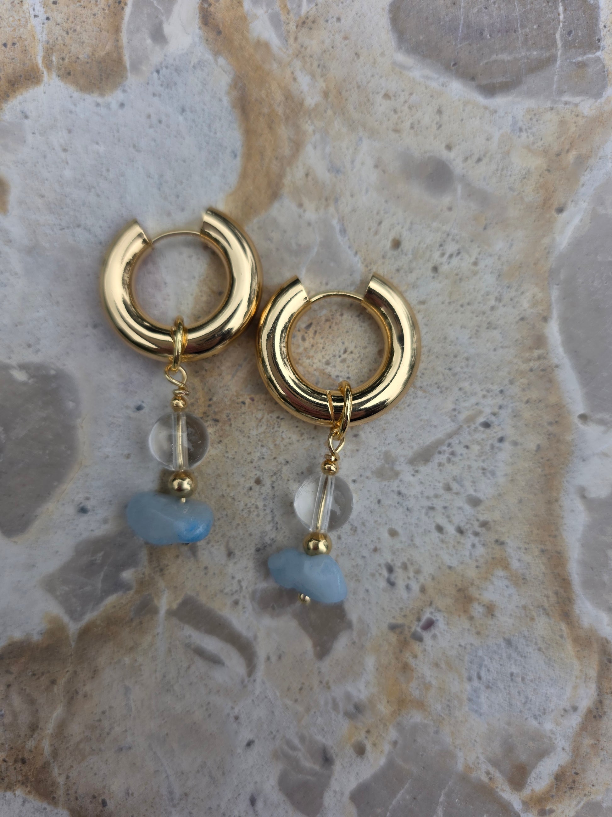 A chunky hoop with a handmade pendant she is rocking amazonite and clear quartz, packed with magic! the pendant is removable for a 2 for 1 kind of vibe!